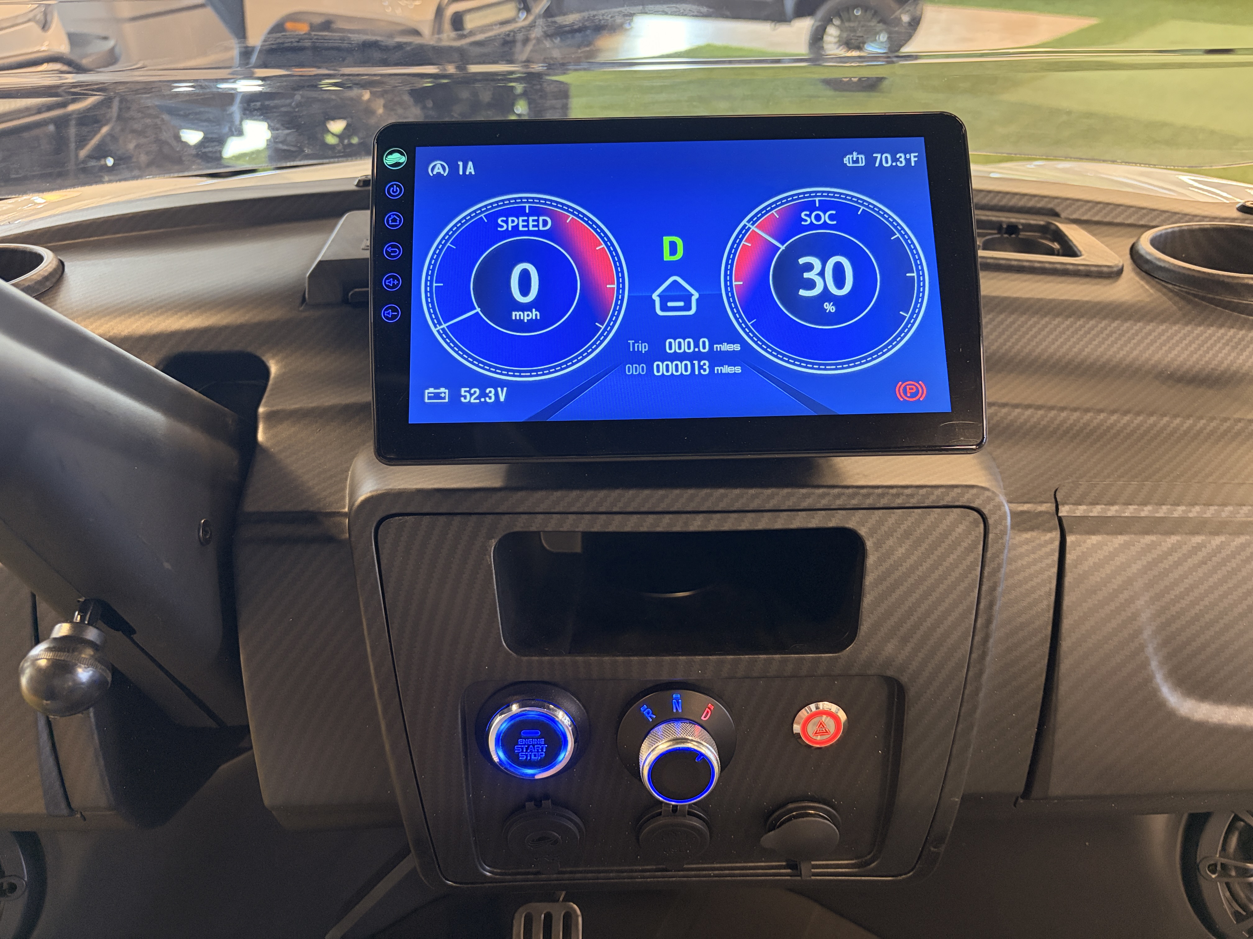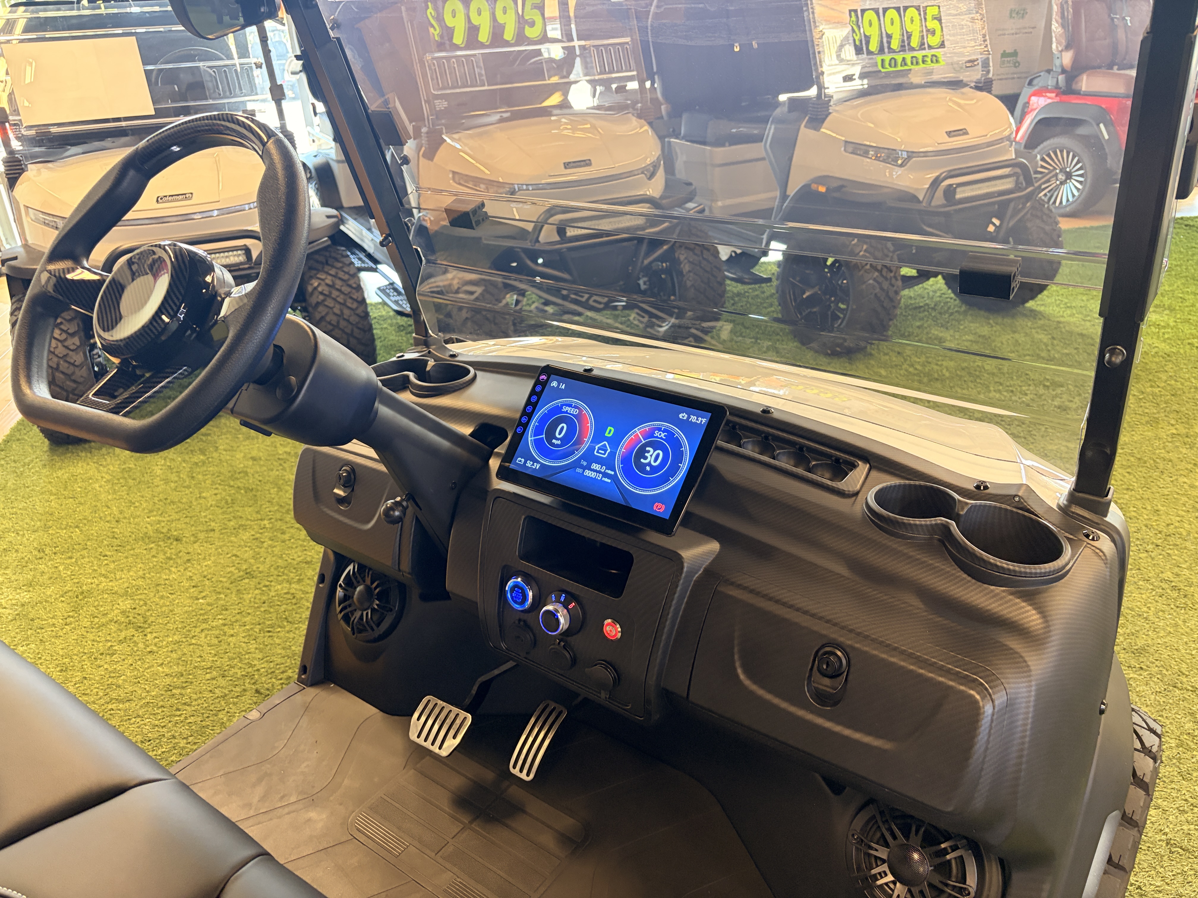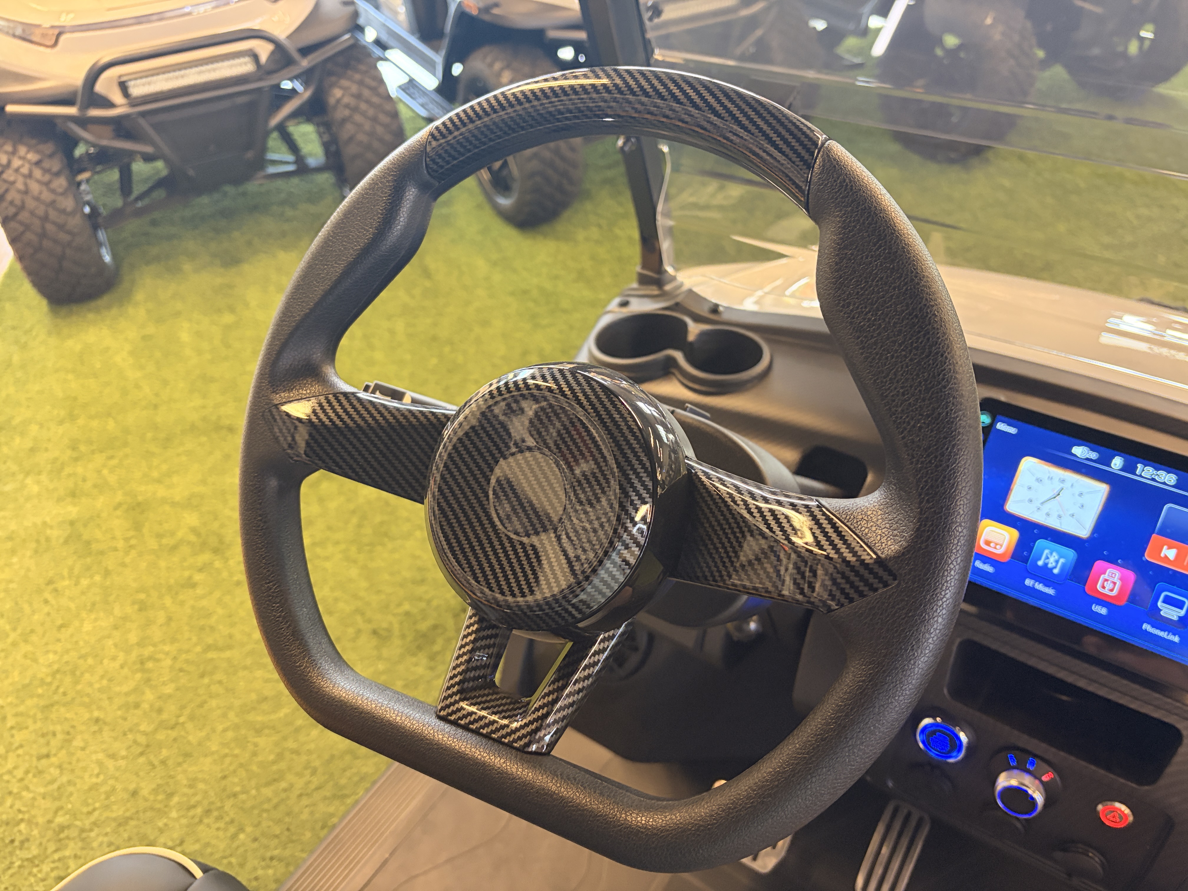 The carbon fiber dashboard on our electric golf carts brings a touch of futuristic elegance to your ride.