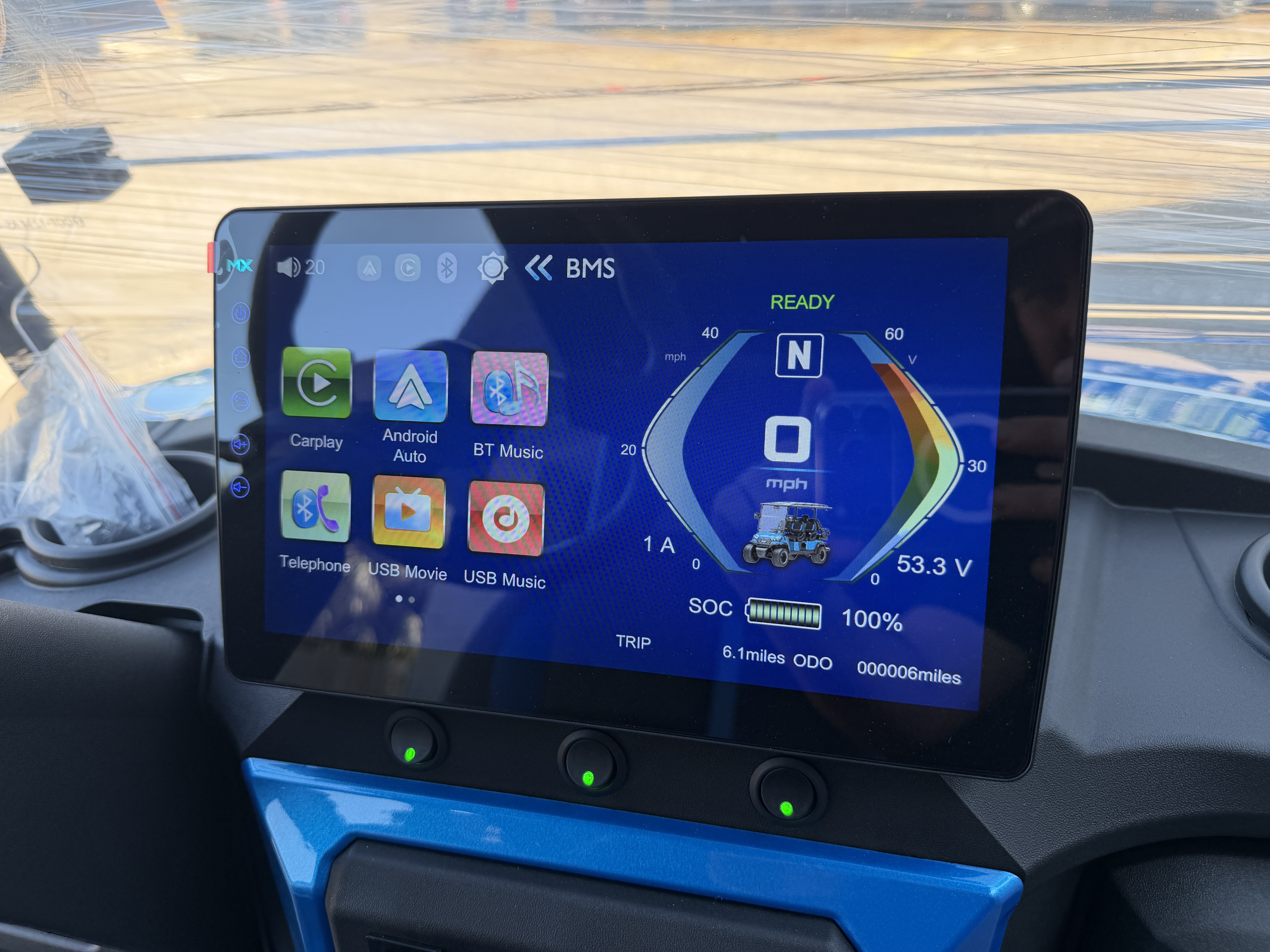 Dash 10.1” Digital Multimedia Touchscreen, Integrated Back-up Camera, SoundExtreme Soundbar, Bluetooth Connectivity for Phone, Music, Radio, Forward/Neutral/Reverse Switch for Easy Control, Locking Glove Compartment, USB Ports and Pre-Wired 12V Switches, Cup Holders, Tilt Steering, Tee & Ball Holders, Secure Key Switch, Foldable DOT Certified Windshield