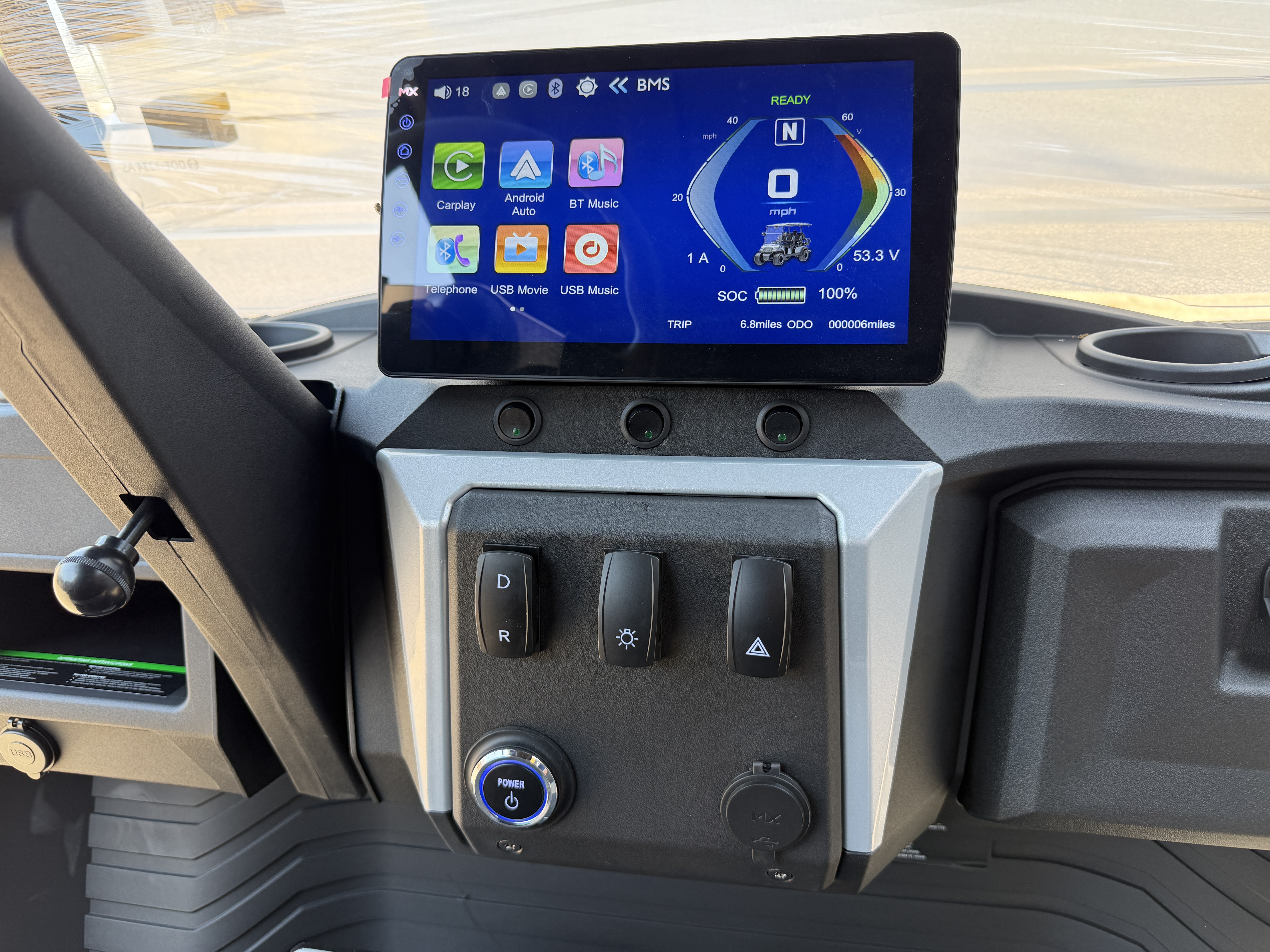 Dash 10.1” Digital Multimedia Touchscreen, Integrated Back-up Camera, SoundExtreme Soundbar, Bluetooth Connectivity for Phone, Music, Radio, Forward/Neutral/Reverse Switch for Easy Control, Locking Glove Compartment, USB Ports and Pre-Wired 12V Switches, Cup Holders, Tilt Steering, Tee & Ball Holders, Secure Key Switch, Foldable DOT Certified Windshield